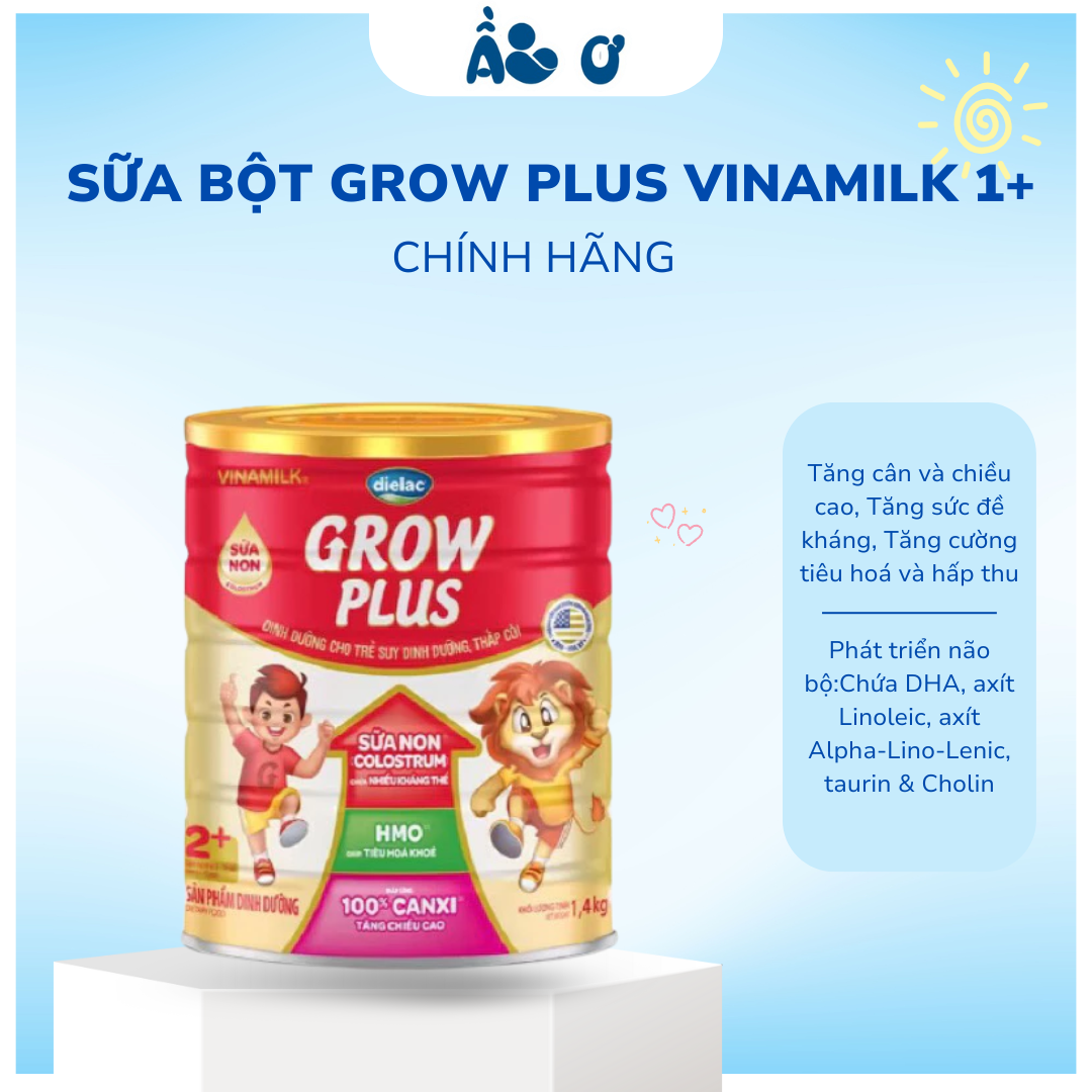 Sữa cho trẻ thấp còi Dielac Grow Plus cho trẻ từ 2-10 tuổi có hàm lượng các thành phần dinh dưỡng chính trong 1 ly đã pha đáp ứng 100% khuyến nghị nhu cầu dinh dưỡng RNI về sữa cho trẻ thấp còi, suy dinh dưỡng dưới 5 tuổi theo chuẩn quốc tế FAO/WHO
